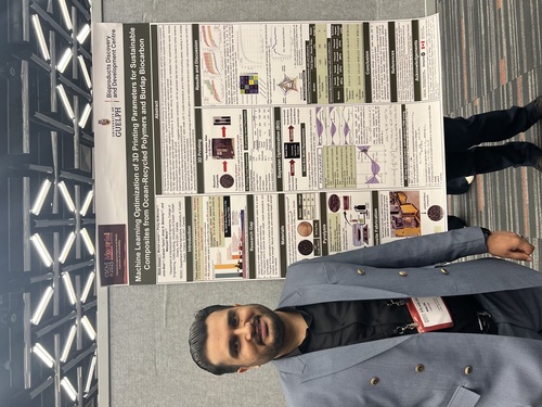 Malik Hassan presented a poster titled, "Machine Learning Optimization of 3D Printing Parameters for Sustainable Composites from Ocean-Recycled Polymers and Burlap Biocarbon".