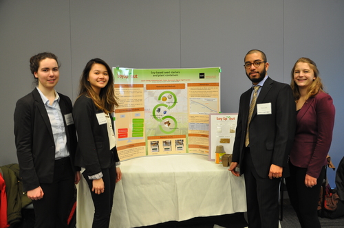 Undergraduate students Claire Benwood, Joyce Cheng, Miguel Vigil, and Alexandra Ball, with their project on SoySprout.