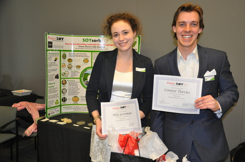 Graduate students Aly Gowman and Connor Davies, with their second place project on SOYsorb.
